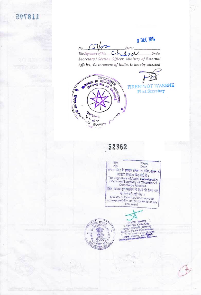 Evidence Consultancy India Pvt. Ltd (ECIPL) completes Certificate Attestation from Ethiopia Embassy and also provides Ethiopia Embassy Legalization in India for Birth, Marriage, Degree, Diploma, PCC Certificate as well as Export or Commercial Document in New Delhi, India. When some India based Company wishes to Export their products to Ethiopia, then they must have to Attest or Legalize some relevant Commercial Documents. The requirement of Documents is different as per the rules of the destination Country as well as the type of products to be exported. To Export Ethiopia normally the following Commercial Documents need to be Attested or Legalized from Ethiopia Embassy in India. The Commercial or Export Documents will be Attested and Legalized from Ethiopian Embassy, New Delhi after the Attestation of Chambers of Comemrce in India.